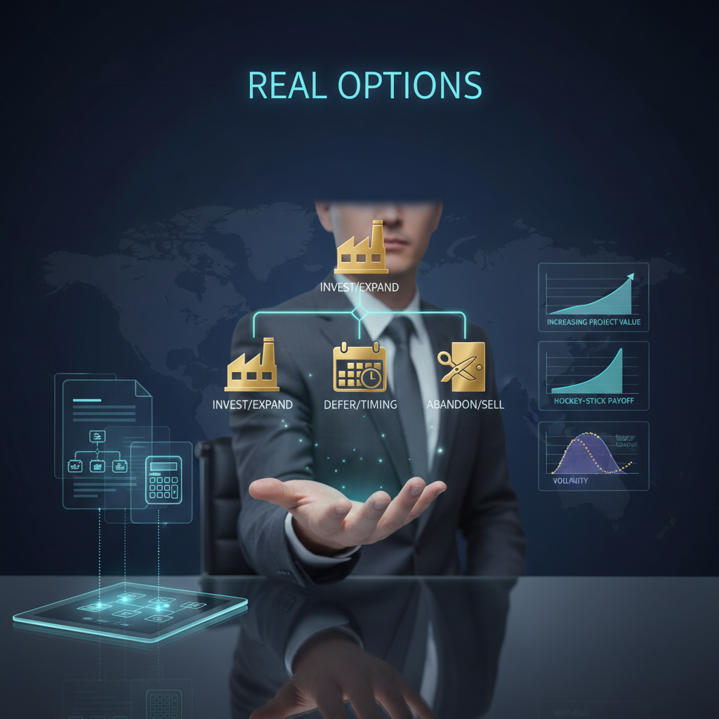 Real Options valuation is a framework for assessing investments that explicitly incorporates managerial flexibility and uncertainty, borrowing concepts from financial options pricing. Instead of treating an investment as a single, now-or-never decision with fixed cash flows (as in traditional discounted cash flow analysis), Real Options recognize that managers can adapt over time—delay, expand, contract, abandon, or switch projects—as new information arrives. These choices resemble call and put options on real (non-financial) assets, and their value can be estimated using tools such as binomial lattices, Black–Scholes-type models, or simulation.
